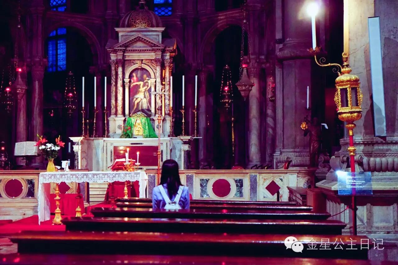 幾位虔誠的圣徒正在用心禱告著,在一層一層的細語中不斷疊加,像經文一樣不斷頌念,而我就坐在他們的旁邊,從書包里翻出紙筆,打算用清新的水彩渲染這幅充滿著無限溫柔而又別緻的文藝電影畫面。 在這裡,忽然忘卻了時間的流逝,忘卻了早已是傍晚的威尼斯城,忘卻了雨滴掉落的聲聲作響,還有人生中帶給我無限的煩惱與迷惑。