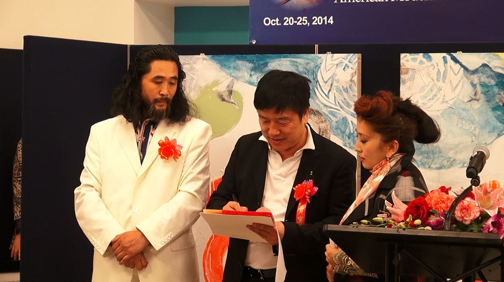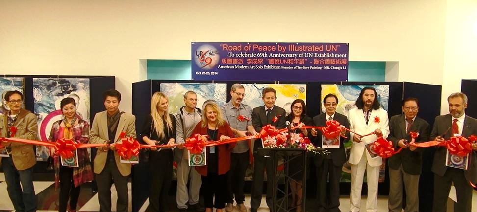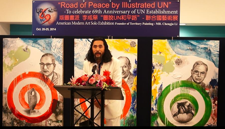 久安電視記者聯合國總部報道:版圖畫派創始人李成舉先生應聯合國的邀請,於2014年10月20日至25日聯合國成立69周年之際在聯合國總部大樓隆重舉行個人畫展。為了響應聯合國千年計劃目標,配合主辦方達到宣傳和平理念,世界各行業都來支持這一目標早日實現的願望,版圖畫派創始人李成舉及其非政府組織聯合國藝術家協會,以圖說的形式,描繪聯合國69年來的和平與發展,創作了《圖說UN和平路》巨幅作品,引起了聯合國官員和藝術界人士的極大關註和興趣。