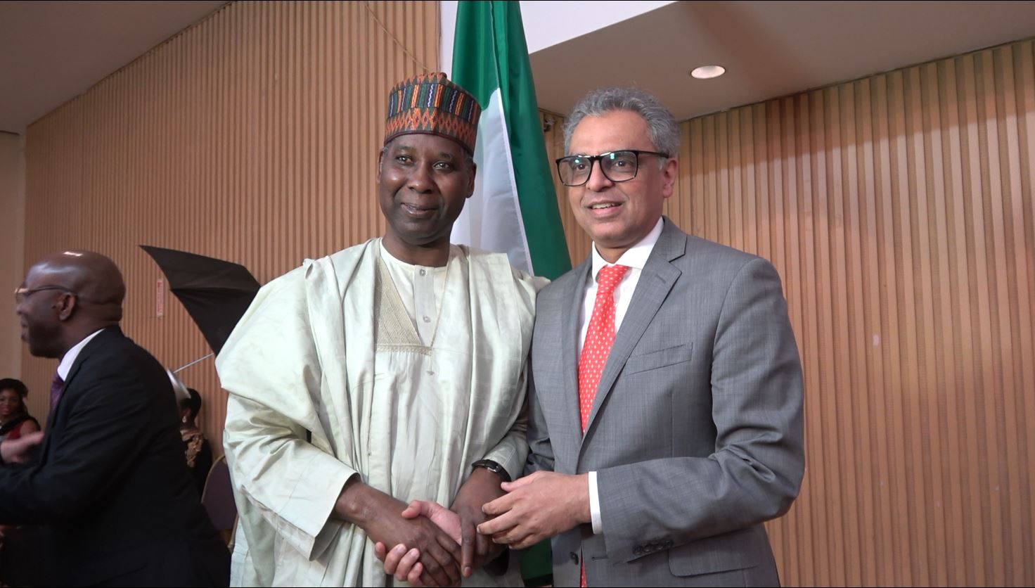 候选74届联大主席尼日尼亚常驻联合国大使(右一)在曼哈顿美国宫音节前来祝贺的各国常驻联合国大使