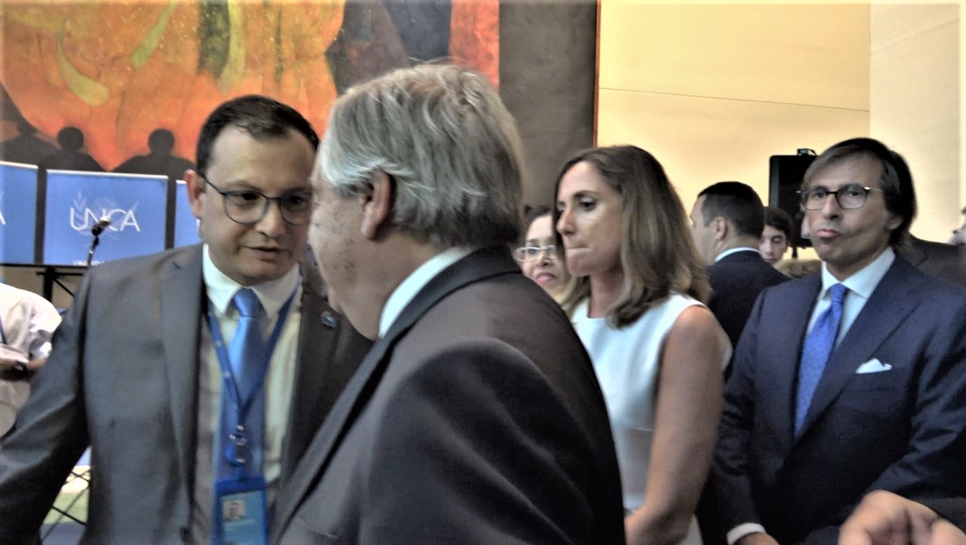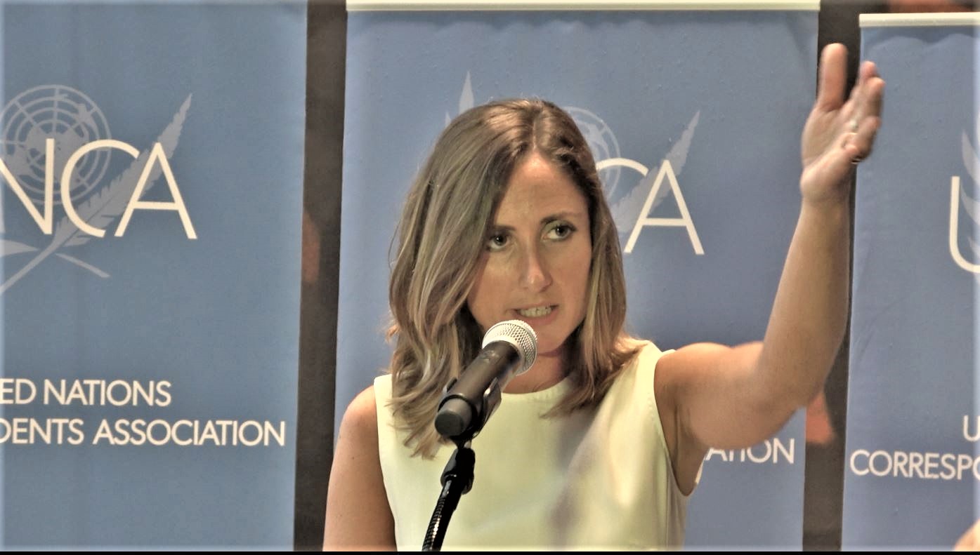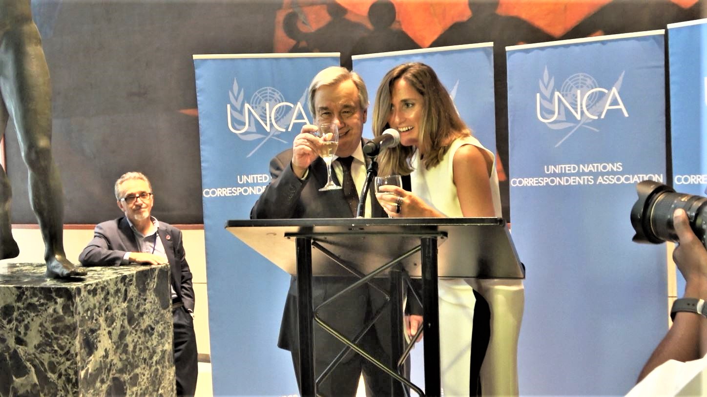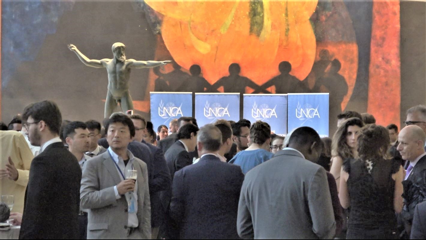 编者按语:联合国记者协会6月19日在联合国总部入口处大厅举办71年度庆祝活动,联合国秘书长古特雷斯出席并致辞,各国来宾近三百人出席了活动。中国、日本、意大利等国家提供了美味佳肴,供参会的嘉宾品尝。 联合国记者协会主席ANSA新闻社Valeria Robecco 首先发言介绍了联合国记者协会71年的概况,并对中国、日本、加拿大、意大利等国为这次活动提供的美食表示感谢。随后联合国秘书长生动风趣地做了主旨发言,祝贺并赞扬联合国新闻界记者协会对新闻事业和新闻对维护新闻自由与人权的努力和贡献。 联合国秘书长古特雷斯发言结束后,因公务先行离开,随后来宾们继续享用佳肴美食,有来宾随着音乐亲不自禁地跳起舞来,场面热烈而欢乐。 联合国总部大厅联合国新闻记者协会71周年会 联合国总部大厅联合国新闻记者协会71周年会 联合国新闻记者协会主席ANSA新闻社 Valeria Robecco 联合国秘书长致辞