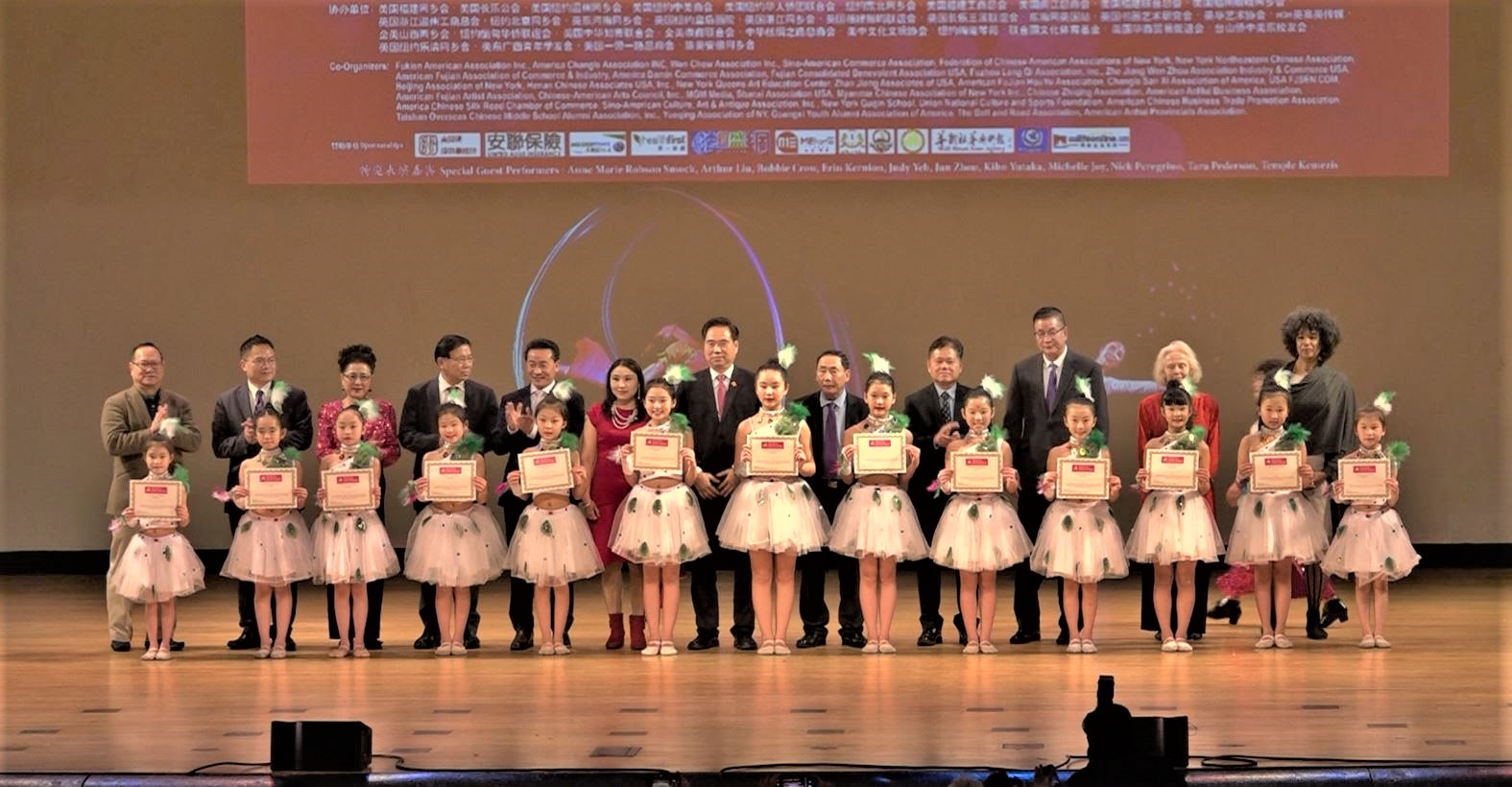编者按语:继今年 2019 年 7 月 6 日 非盈利机构 “梁坤钿现代古典舞蹈团” 在林肯中心举办 “梁坤钿舞蹈专场演出” 后,“梁坤钿舞蹈中心” 2020 年 1 月 4 号在 Queens College 纽约皇后大学的 Colden Auditorium 大剧院举办 “庆祝梁坤钿舞蹈中心成立 10 周年暨中华人民共和国成立 70 周年和迎中国新年文艺表演”。 专场演出以“弘扬中华舞蹈艺术, 培养新一代艺术人才”为主轴,旨在提升青少年的艺术审美能力和艺术鉴赏力,让华裔青少年认识中国舞蹈艺术文化,同时与海外的华人和华侨一起歌颂祖国,同贺中国新年。 演出邀请了非华裔芭蕾舞蹈演员联袂共舞,她们都是梁坤钿老师的纽约大学 NYU 修读 “舞蹈教育系” 研究生硕士学位的同学们。梁老师和他们的合作是为了体现中西舞蹈艺术的融合,促进多元文化的交流。 福建同乡会主席郑思奇(中)等社区领袖为儿童演员颁奖 梁坤钿舞蹈中心十周年专场演出主持人天宜 纽约州众议院议长奥提斯颁奖给舞蹈家梁坤钿 颁奖嘉宾联合国新媒体久安电视副总裁 Louis Galivs 中国纽约总领馆两位领事也是颁奖嘉宾 社区领袖为儿童演员颁奖 开场舞中国红 (责任编辑:admin) |