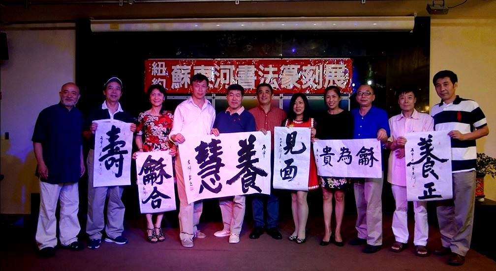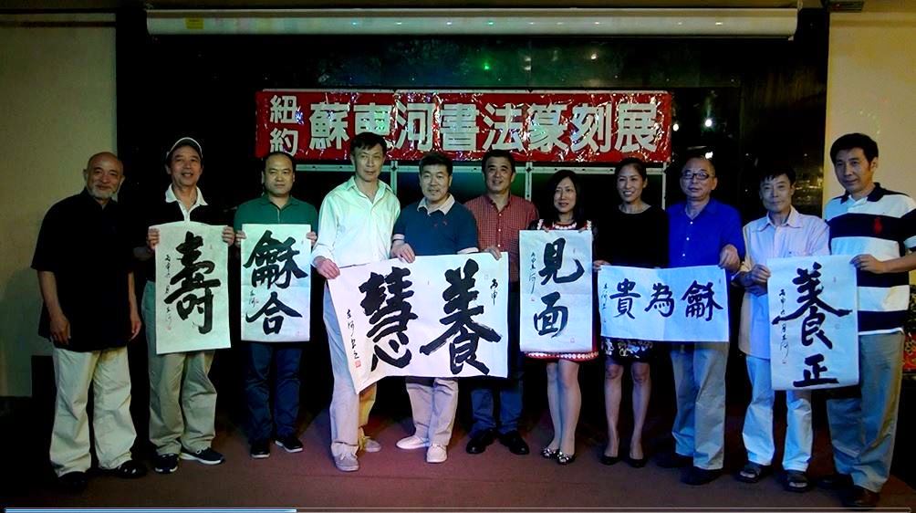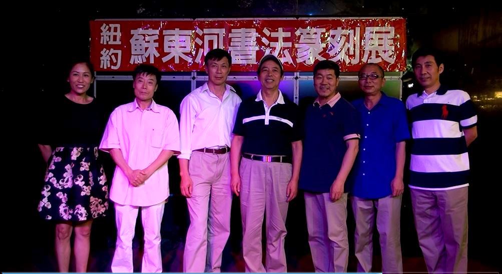 久安电视纽约见面会所报道:借中国大陆庆祝共产党95岁生日之际,著名书法篆刻艺术家苏东河在纽约见面会所为欢送陶瓷艺术专家于乐土回国举办欢送晚宴,向来参加晚宴的十几位书画艺术家、收藏家、作家等通报了他近期的办展计划。苏东河告诉大家,首先他应法拉省图书馆馆长邱辛晔之邀,美国国庆节之后数日,7月8日将在法拉盛盛图书馆举办一个小展,展出他部分书法篆刻精品,为期十天。随后应台湾星云大师邀请在佛光山庄举办为期一个月的大展。