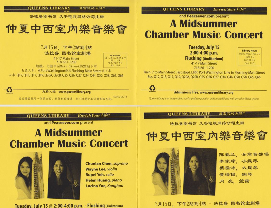 由法拉盛圖書館、久安電視網絡公司聯袂舉辦的仲夏室內樂音樂會,7月15日將在法拉盛圖書館隆重登場。這場音樂會的特色是以中西名演奏家傾情聯袂演出的。而可圈可點的的是,臺灣演奏家和中國大陸演奏家同臺演出,西洋樂器與中國千年古老樂器箜篌同臺演出,體現了臺海兩岸一家親,同屬中華民族源遠流長的歷史定位。