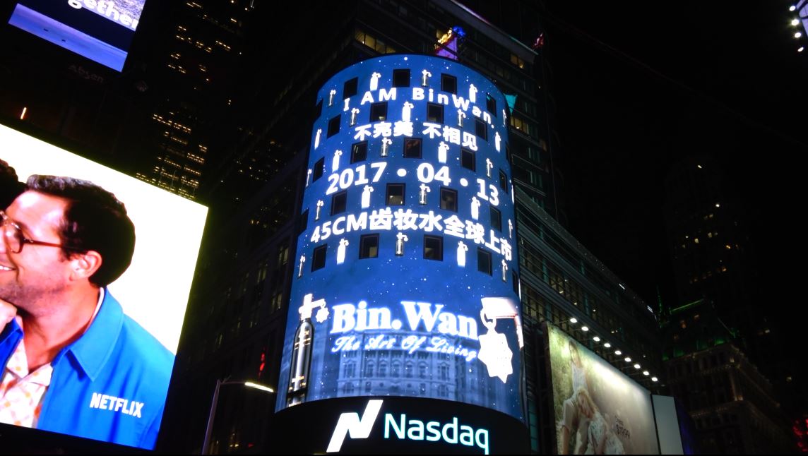 BinWan 牙齒保養化妝水"齒妝水”時代廣場納斯達克大屏亮相 ![]() 彬万家族产品带给你生活的艺术和享受